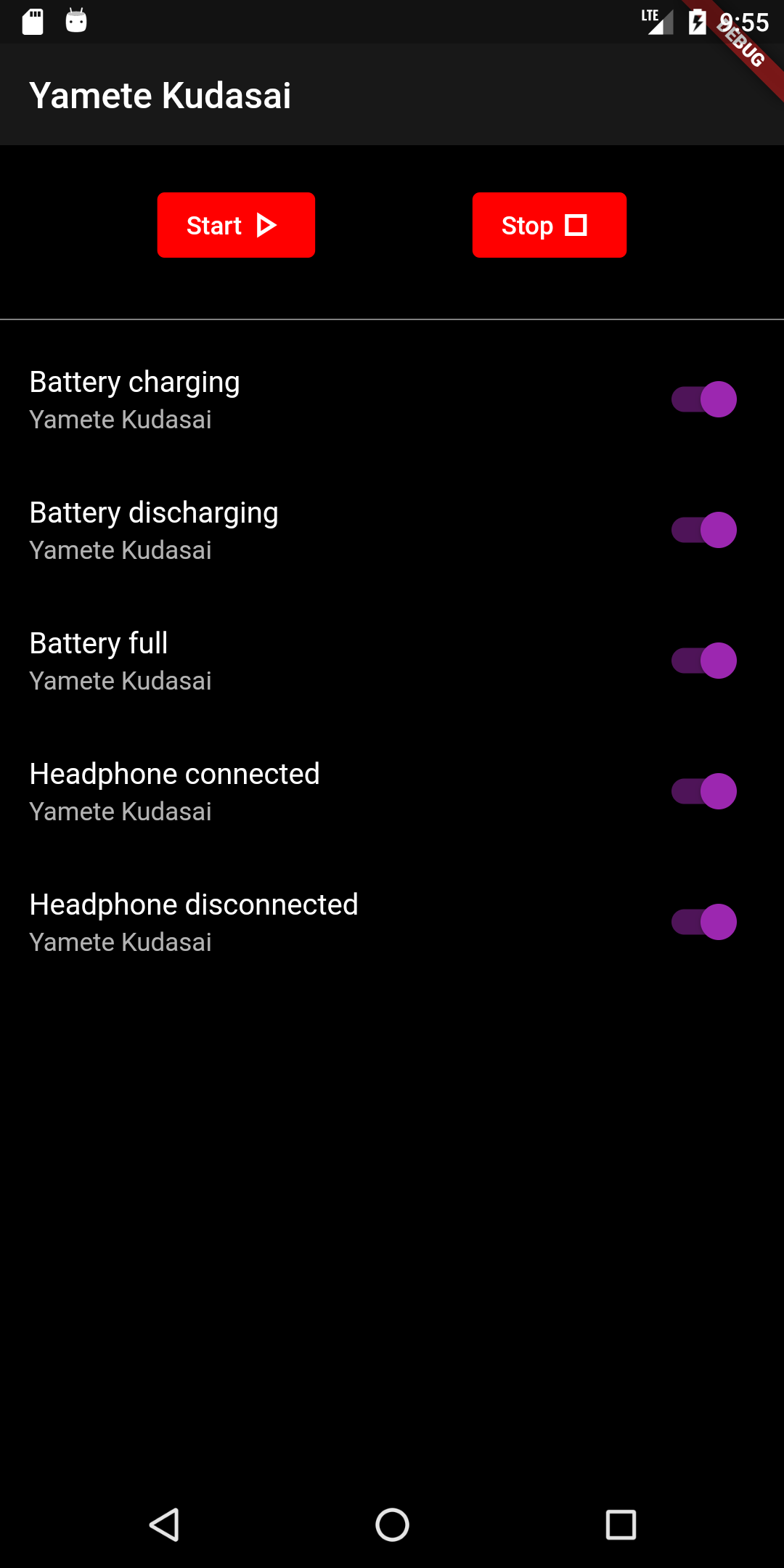 When you enter the app, just click start and whenever an event happens one of the precisely chosen sounds gets played. If you want to turn off the sound playing for a specific event, just toggle off the button behind it. For playing other sounds than the standard "Yamete Kudasai", click on the entry for the event you want to change and a new window pops up where you can set the sound which should be played on the event.